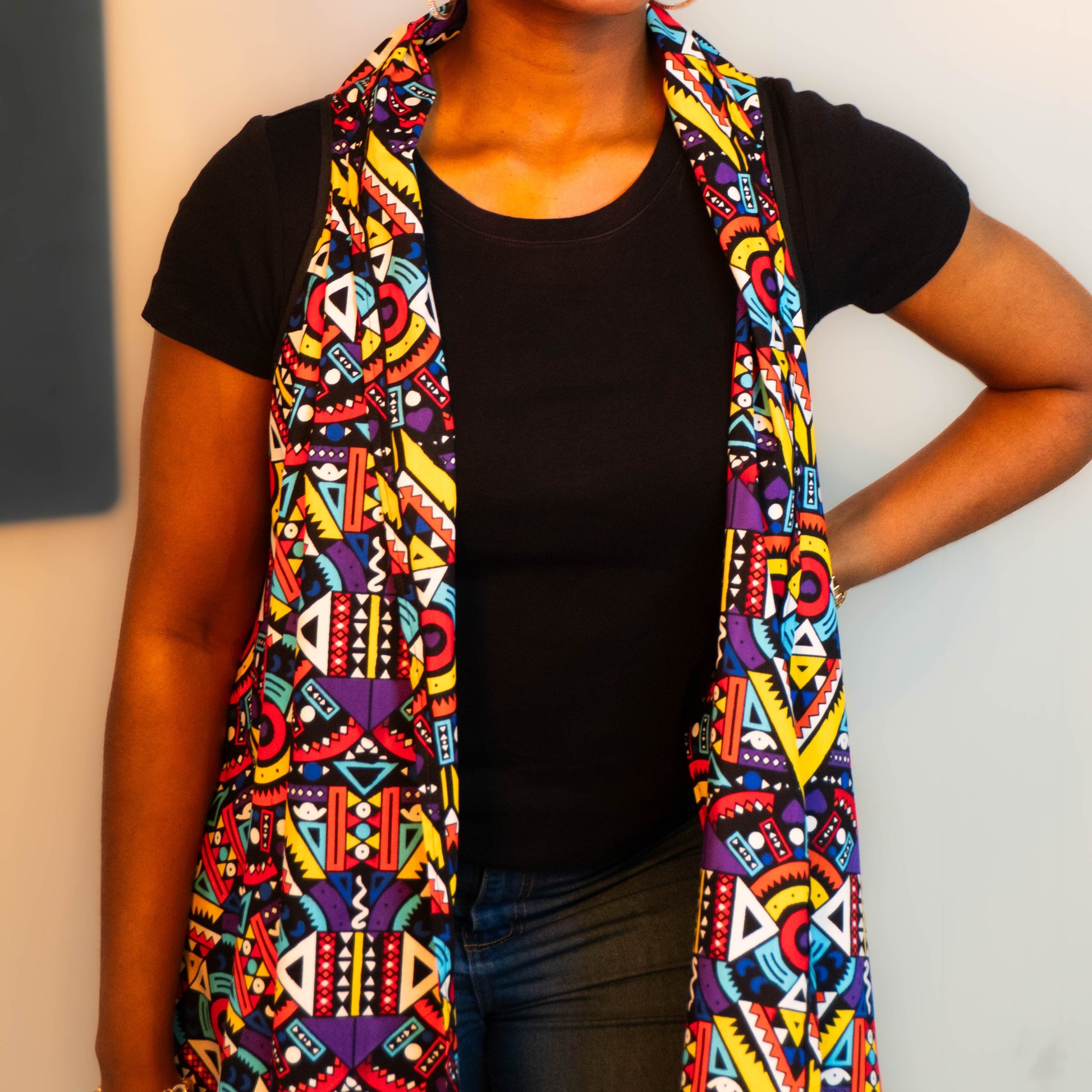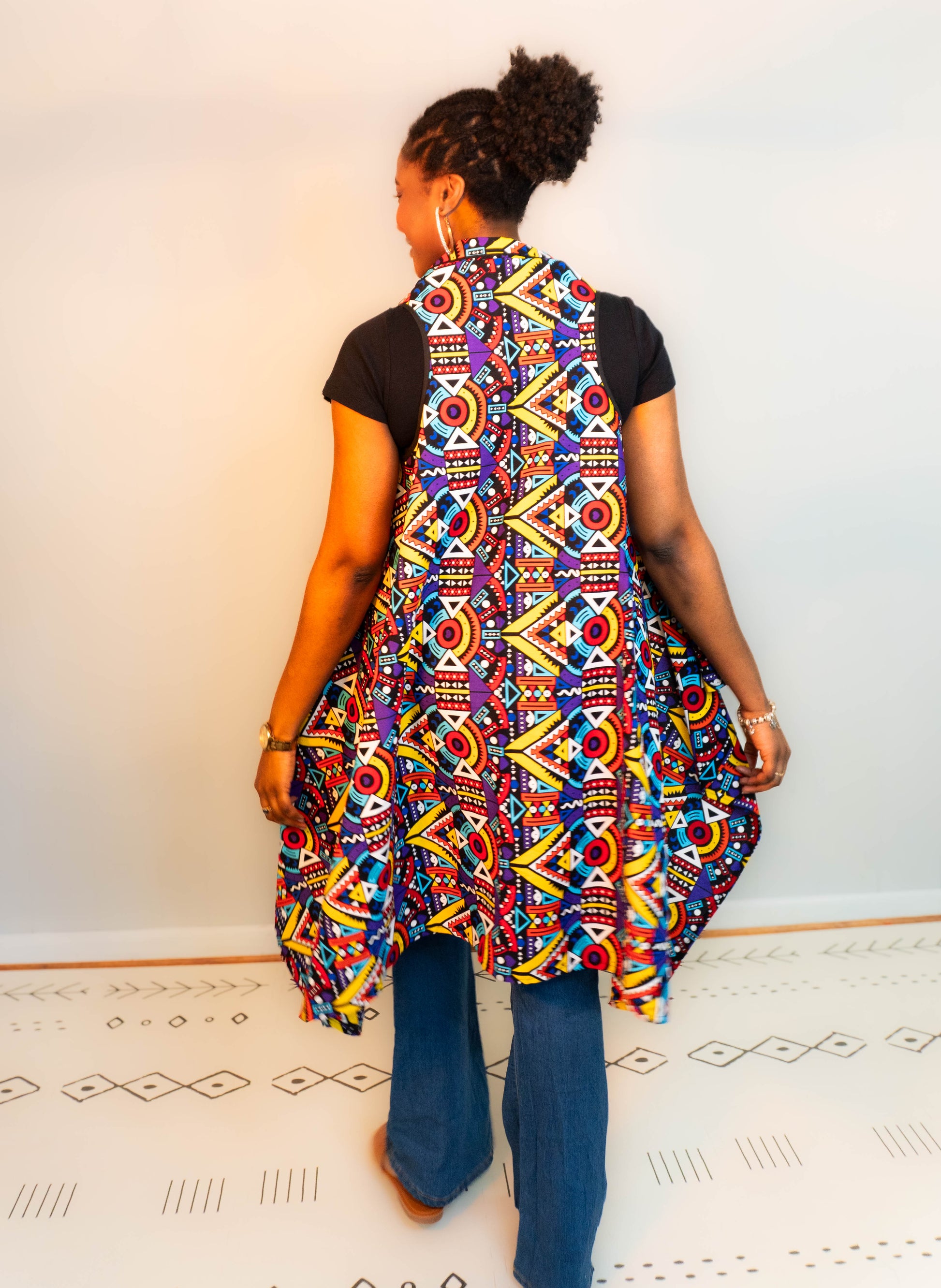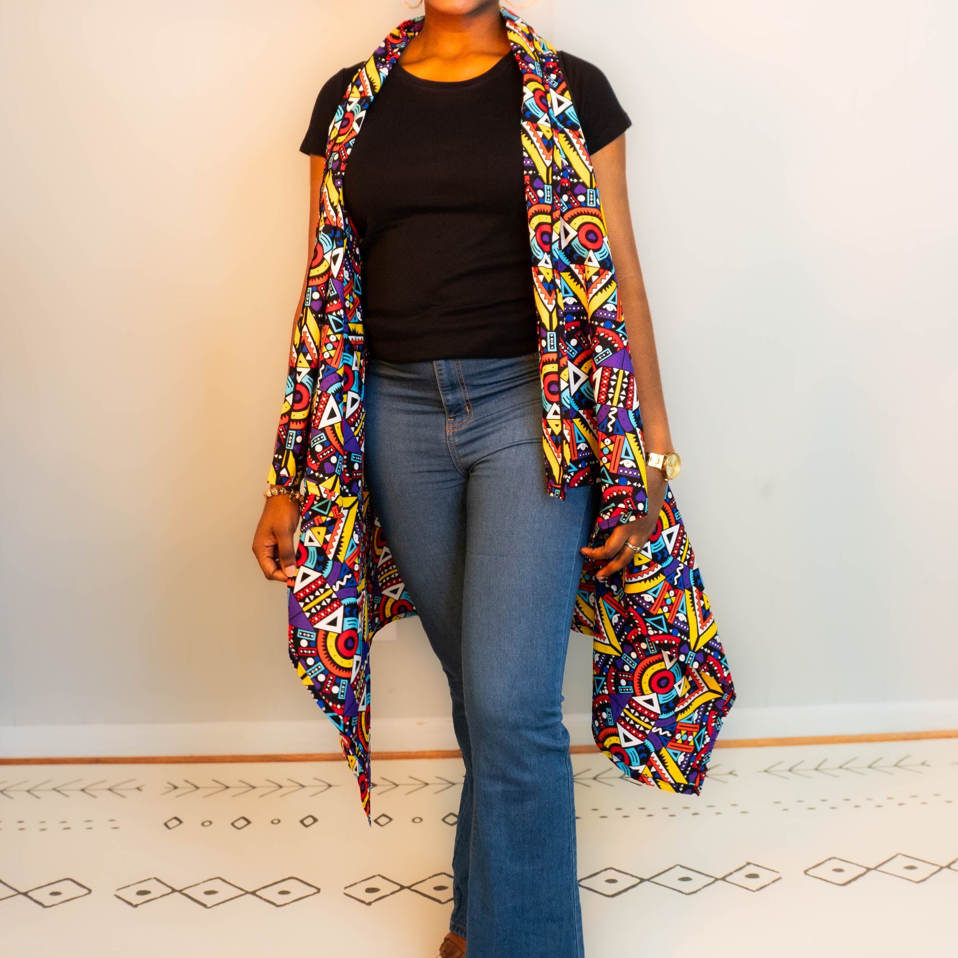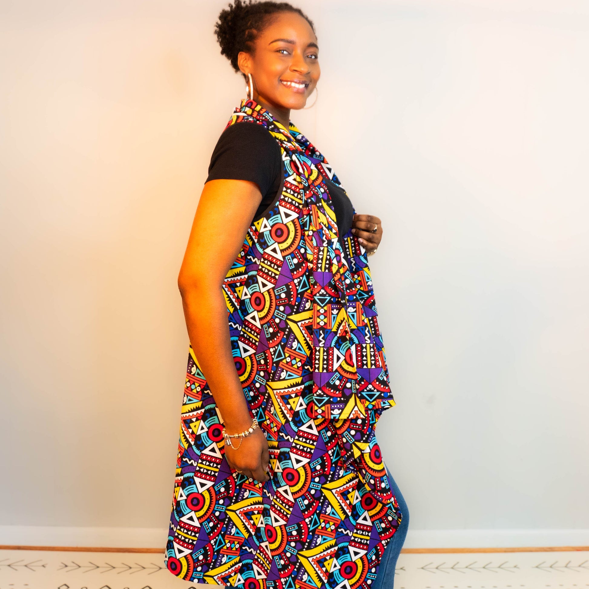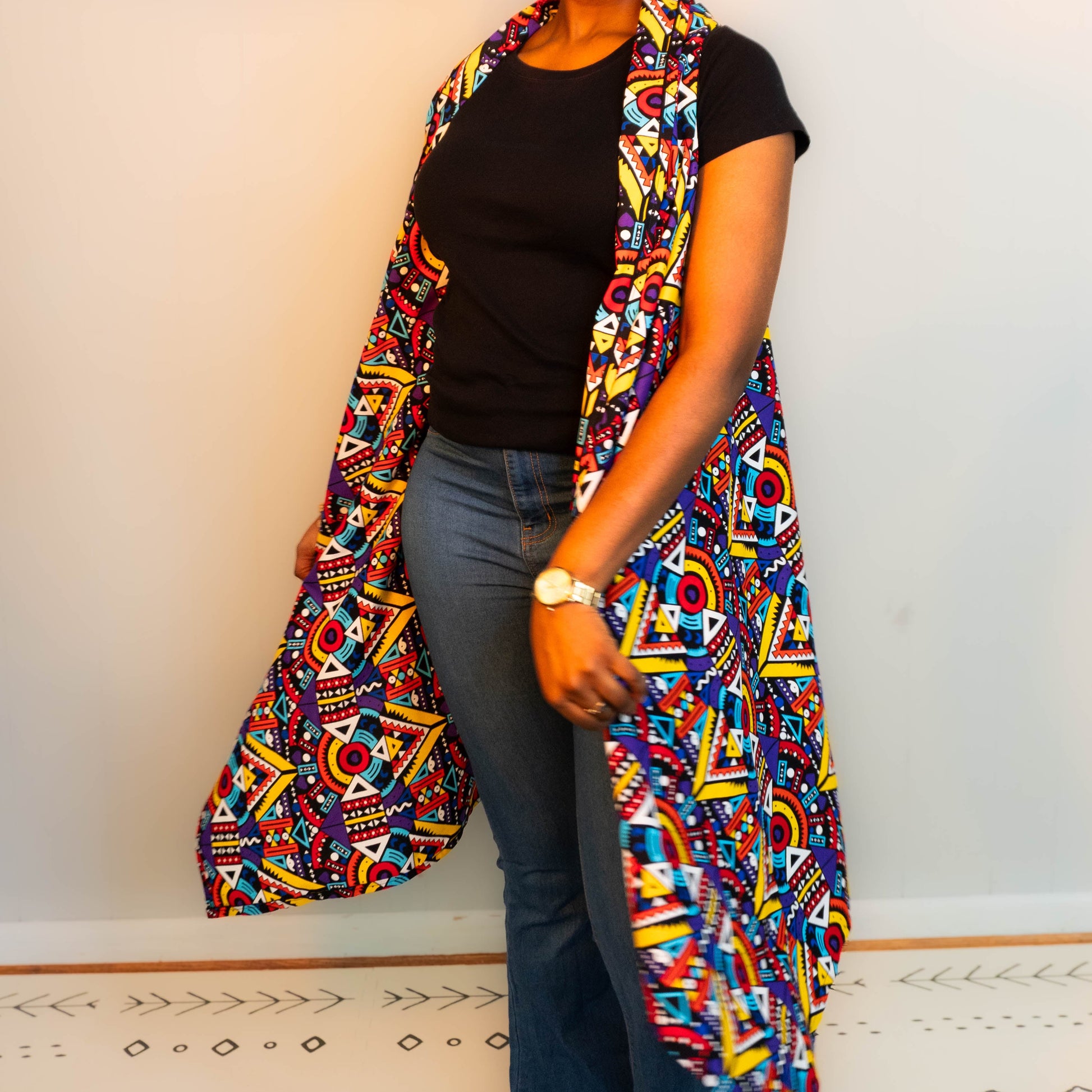 Celebrate every moment with the Joyful Motion Cape in vibrant Ankara cotton. Its bold geometric print radiates confidence and fun, while the movement-friendly cut lets you dance through your day with ease. One size fits most, making it perfect for layering and turning heads wherever you go. Wrap yourself in joy and unstoppable style!