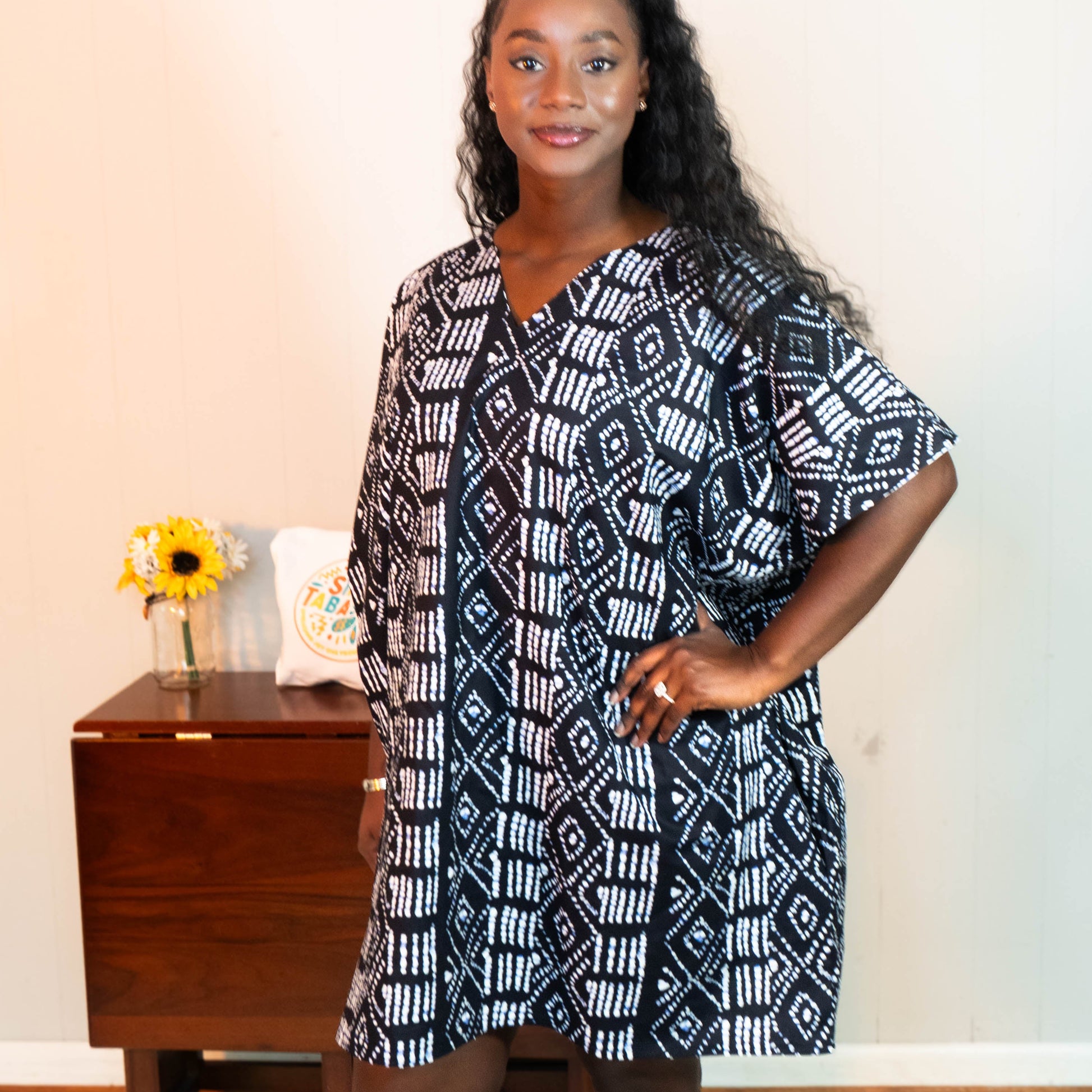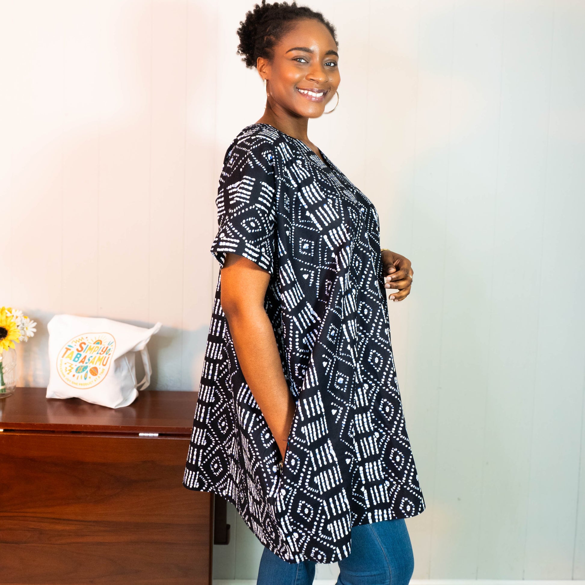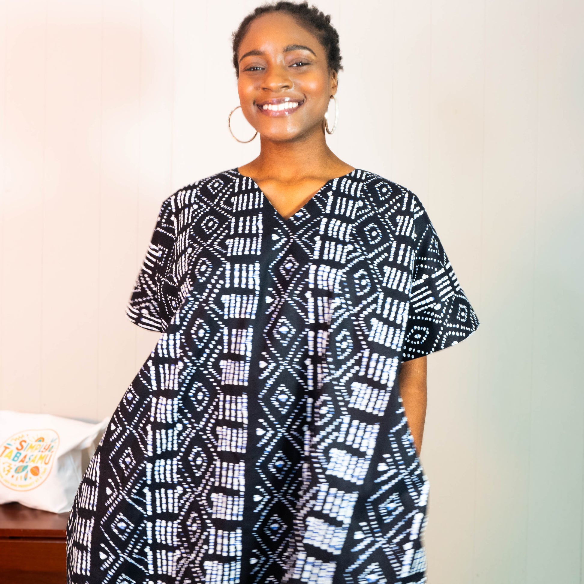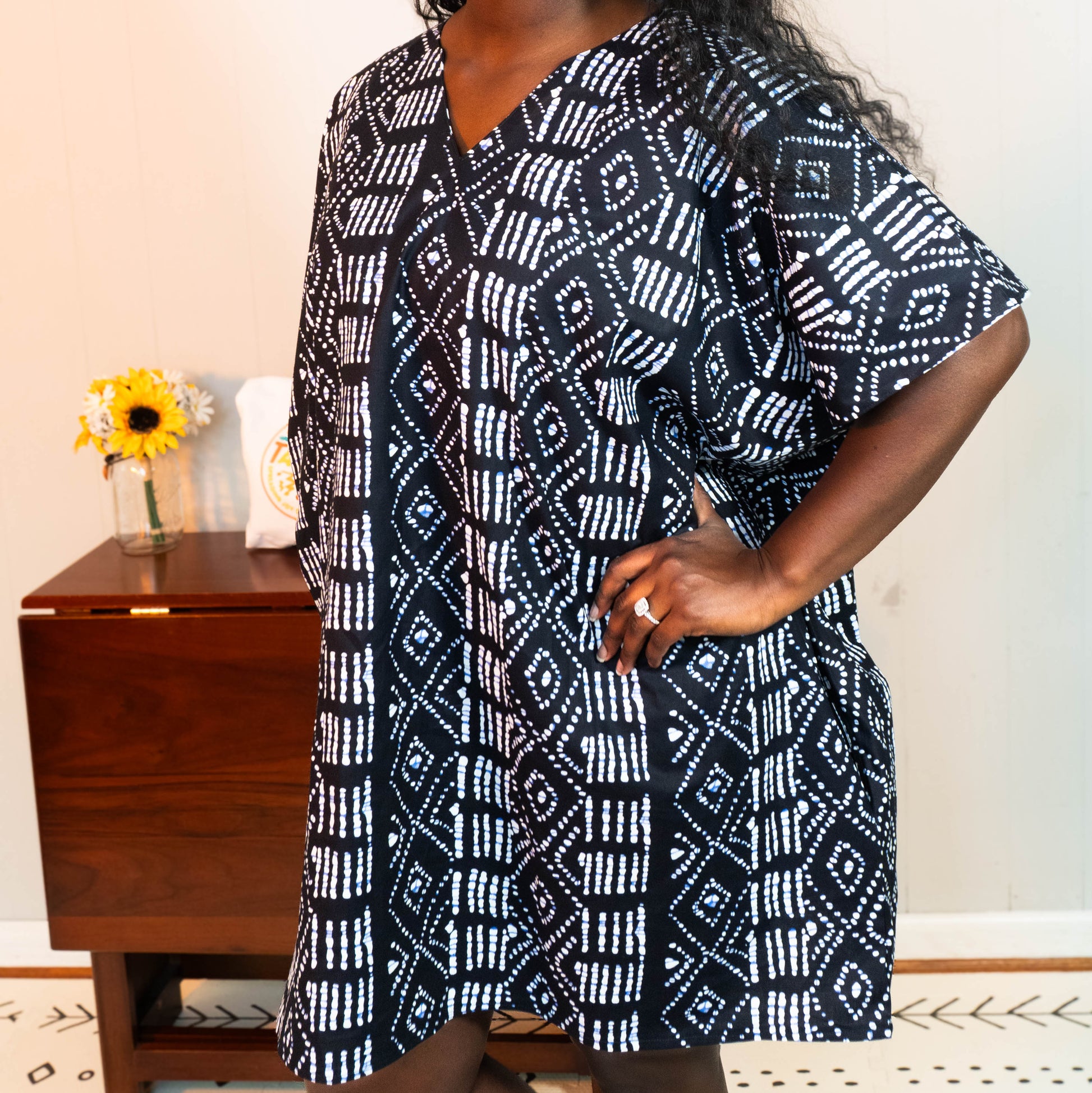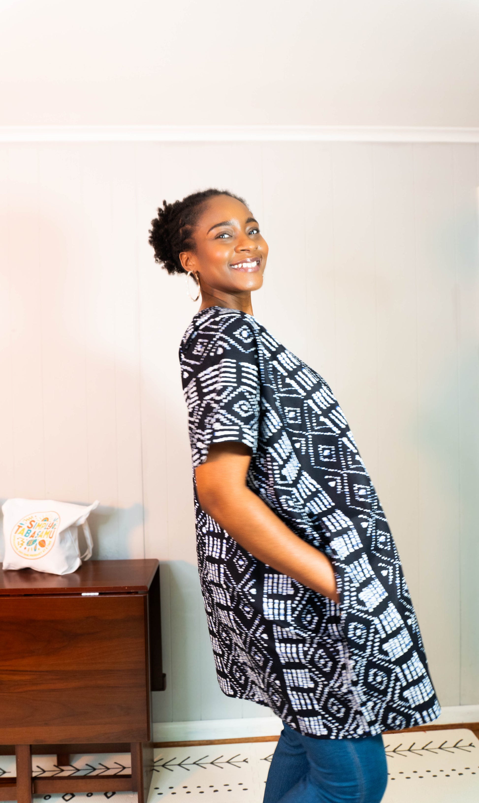 The Echo Shift – Grounded Glow is a playful take on timeless elegance. Made from 100% shibori cotton, this dress features a soft drape with just enough structure to flatter your silhouette. Its black, white, and blue print pairs beautifully with the Echo Kimono or stands out on its own. Wear it to lead with joy and make a quietly bold statement.