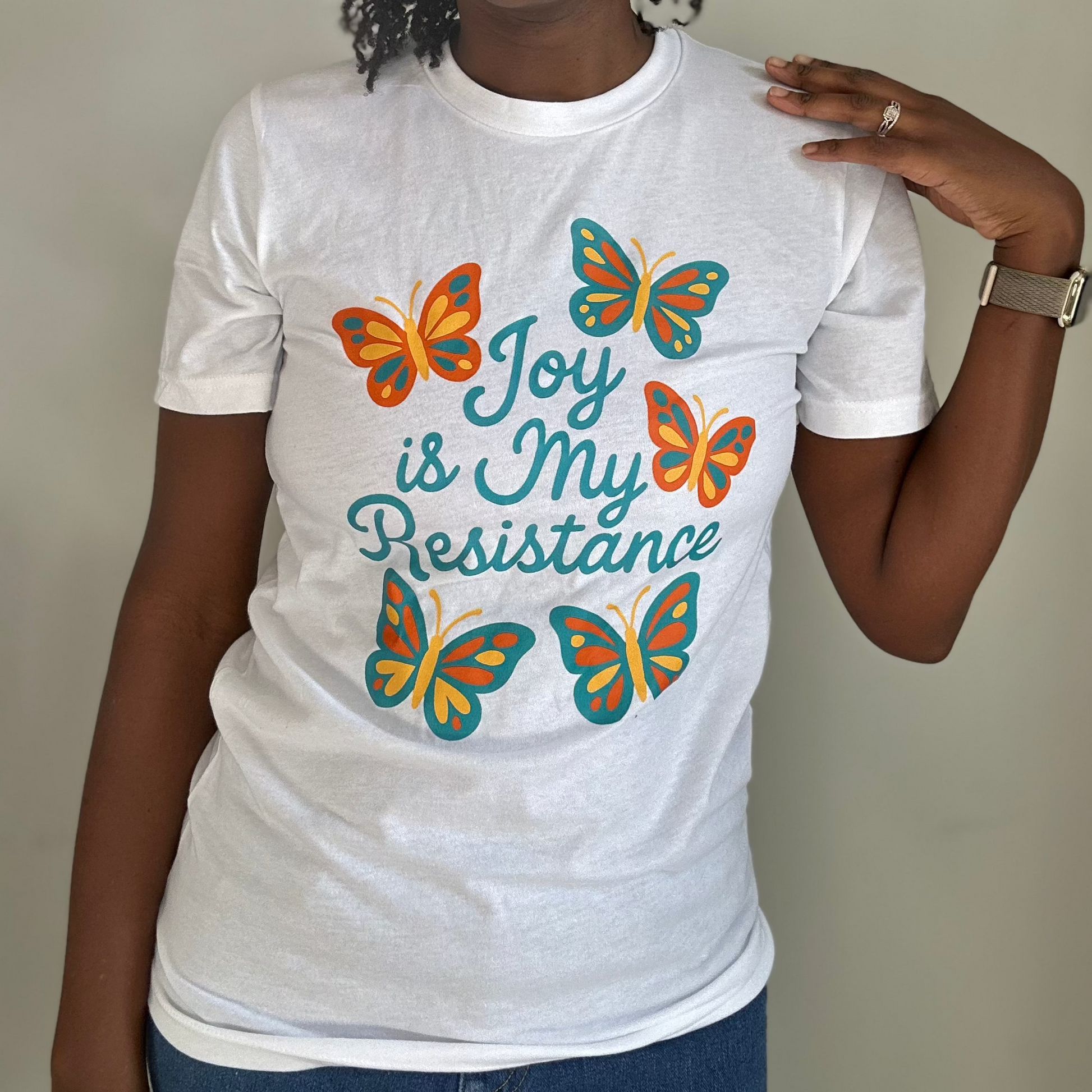 This design features vibrant monarch-inspired butterflies surrounding the message “Joy Is My Resistance,” symbolizing transformation, endurance, and becoming. Printed on a soft, breathable unisex tee, it’s made for everyday wear, statement moments, and meaningful gifting.