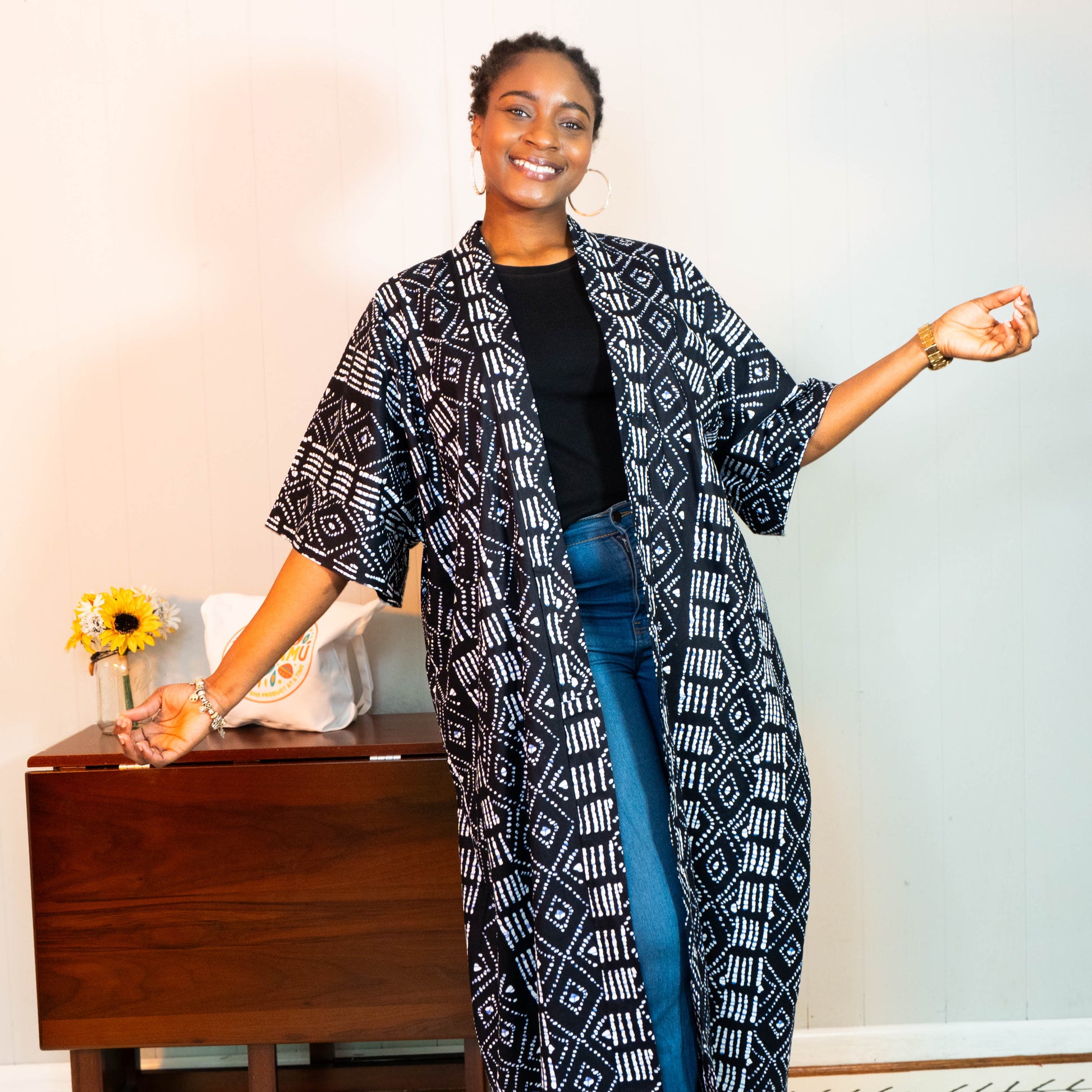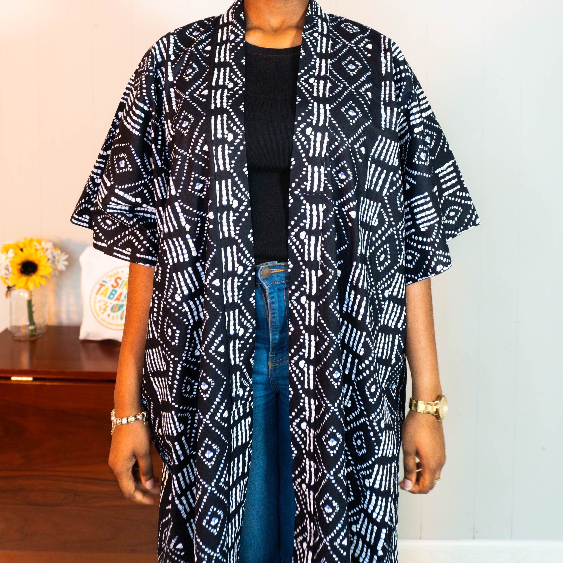 The Echo Kimono – Rooted Joy blends quiet strength with playful style. Crafted from 100% shibori cotton in black, white, and indigo blue, this flowing kimono layers effortlessly over tees, dresses, or lounge sets. Its open front and one-size-fits-most fit make it easy to wear, while the included belt lets you customize your look—dress it up or down to match your mood. Handmade with soul, it’s designed to bring intention and joy to every outfit.